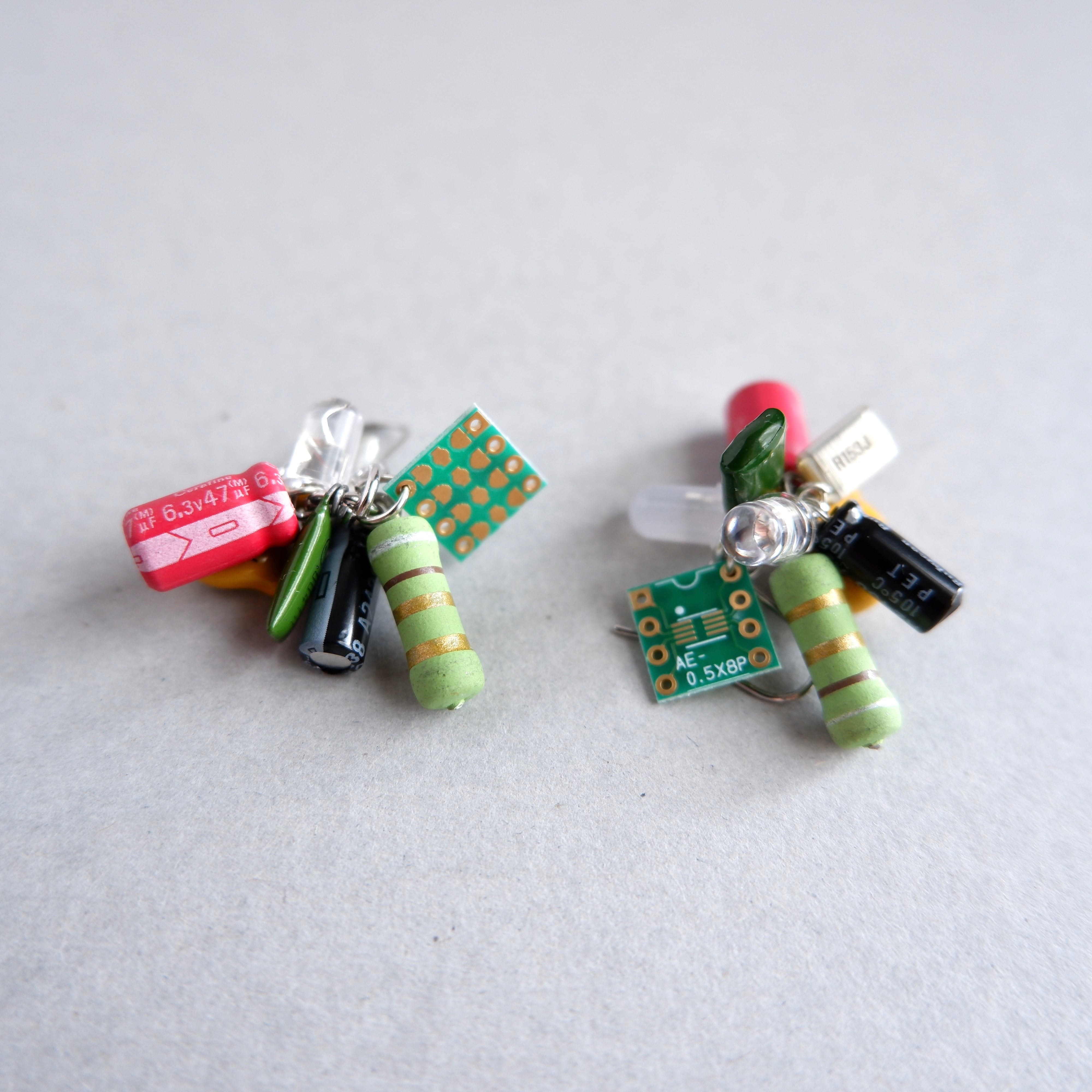 カラフルな電子部品を組み合わせて作った、お花をイメージした一点もののピアスです✳︎